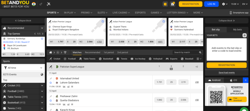 Cricket is one of the most popular sport types in India. This option includes various betting options, like match winner, over/under, handicaps, and more. Also, cricket allows you to bet on match duration and some other unique markets. Check the most popular events for betting at Betandyou: